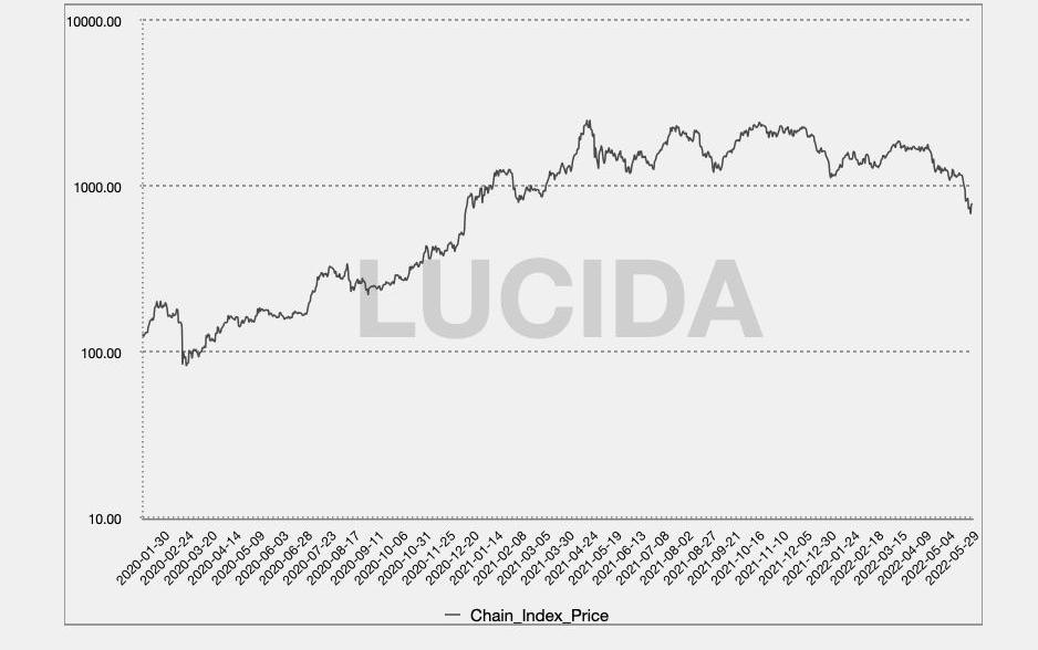 为了更方便地观察公链赛道整体情况,我们将公链指数价格制成了图表,并将坐标轴改成了对数坐标轴。