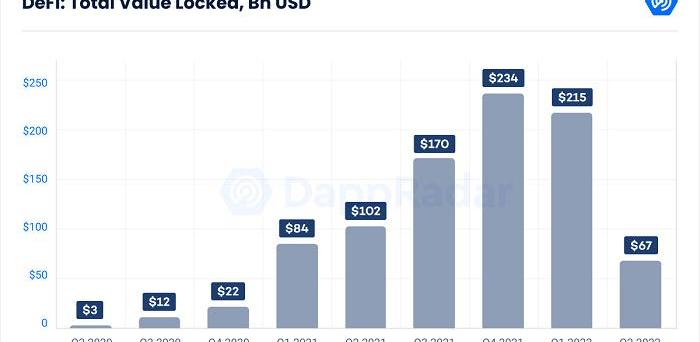 Terra崩溃对DeFi市场产生巨大影响,导致总锁仓量跌至2021年初水平,本文撰写时仅为700亿美元左右,比2022年一季度末减少69%,比一年前下降33%。