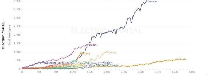 由此看来,强大的开发者生态系统对于Layer1的成功构建至关重要。下图是2021年ElectricCapital关于每月活跃开发者的报告。