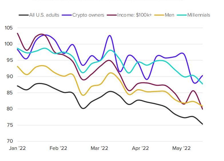 研究公司MorningConsult7月7日的一份报告显示,尽管自1月中旬以来,美国成年人的平均消费者情绪下降了13.5%,但加密货币持有者的信心相对较好,同期仅下降了8.1%。