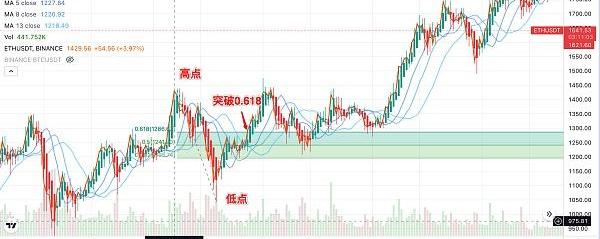 在2021-01-14,ETH反弹到1182,突破了61.8%。一波趋势在2021-01-19突破新高达到1436。