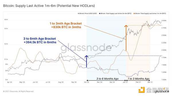 下图显示了这两个年龄段的币种到期量。1 个月-3 个月年龄段的币(累计在橙色区域)增长了+83 万 BTC,而 3 个月-6 个月年龄段的比特币(累计在蓝色区域)增长了+394.5 万 BTC。
