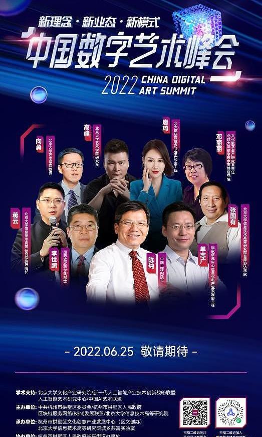 在促进数字艺术与实体经济深度融合的背景下,由中共杭州市拱墅区委员会、杭州市拱墅区人民政府、区块链服务网络发展联盟、北京大学信息技术高等研究院主办,杭州市拱墅区文化创意产业发展中心、北京大学信息技术高等研究院城乡共富实验室承办,杭州市拱墅区人民政府长庆街道办事处协办的“2022中国数字艺术峰会”将于6月25日-26日举行。