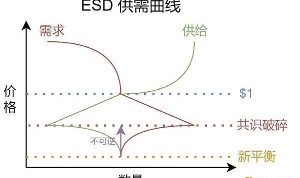 风险资金和持有者的博弈不是没有下限的。当价格足够低时,看不到价格回升可能的市场会迎来恐慌性抛售。此时,对于ESD标准价为1美元的共识开始消失。风险资金也将变得不愿意为一个没有共识,不能兑现的债券买单。所以此时的供需关系就会逆向发展,直到达到一个新的远低于1美元的平衡点。