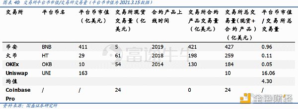 国盛认为,当前尚未有加密资产交易所登陆「传统」资本市场,难以找到对标,但多家交易所基于以太坊和自行开发的区块链主网发行了平台币,这些平台币还在加密资产交易所交易,它们的市值具有一定的参考价值。
