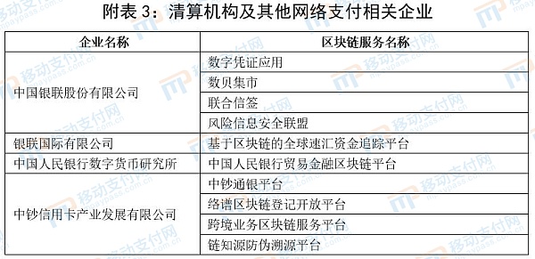 在清算机构等其他网络支付相关企业中,有2家企业涉足融资领域:数研所建立了贸金平台,中钞信用卡建立了跨境融资平台;2家企业涉足信息存证领域:银联和中钞信用卡均有涉足数字凭证、在线签约场景;2家企业涉足信息同步领域:银联国际和中钞信用卡分别涉足跨境汇款、对公支付场景;1家企业涉足数据共享领域:银联建立数贝集市和风险信息联盟;在企业内控领域尚为空白。