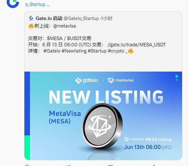 据Gate.io官方推特消息显示,Gate.io交易所将于2022年6月13日上线MetaVisa项目代币MESA。