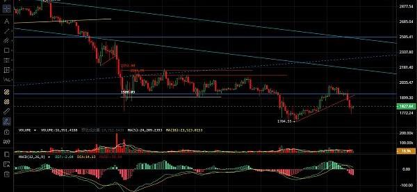 以太坊走势跟随大饼,晚间走出一波瀑布,低位跌至1760附近止跌反弹,昨日文中提及1766接多,恭喜跟上的朋友,目前可以止盈一半带保护,如后市反弹到1880-1900附近则全部离场,四小时级别走出连阴下行,反弹力度也不是很大,短期走势偏弱,但不建议盲目追空,短线呈震荡下行,思路上逢高做空,以太坊建议1860-1900区间做空,目前看1800-1760,若破位1700可以追空