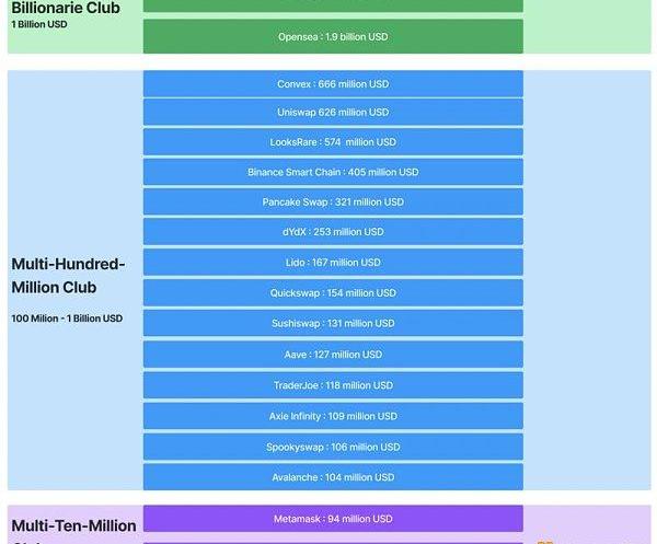 第二档:大部分是Defi协议,总收入最高的是Convex和Uniswap,他们的半年总收入约为600millionUSD。