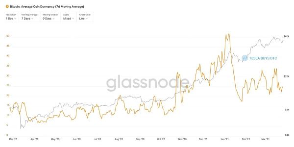 “早期投资者喜欢在每次涨势中卖出加密货币来获利,从而会导致平均休眠时间的增加。然后这个叫埃隆·马斯克的家伙走了过来决定买进,现在早期投资者和我们其他人一样坚定持有比特币。”