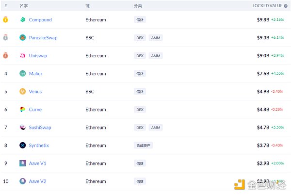 锁仓量排名前十的借贷平台 排名来源:DeFibox