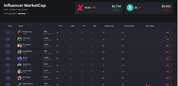 这是一套XcadNetwork创造的对Youtubers的影响力代币化统计面板,用户可以追踪Youtuber的订阅数,CreatorToken的价格统计以及购买入口。