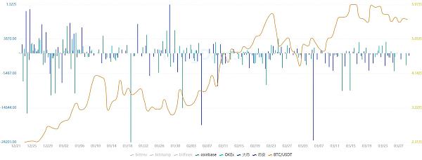 图中ABCDE,Coinbase都出现大额流入BTC现象。其中BC放量流入后,BTC价格呈现现阶段性上涨,D放量流出后,BTC价格出现短时下跌。A是一个持续性放量流入区域,BTC价格在此期间持续上涨。