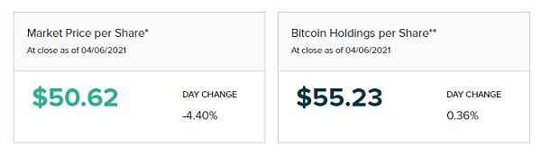 举个例子:4月7日,GBTC股票收盘价为 50.62美元,而实际GBTC每股对应的比特币价格为每股 55.23 美元。这意味着目前GBTC股票是以相当于其资产净值(NAV) 91.7% 的折扣价格成交,也就是说GBTC目前存在8.3%的负溢价。