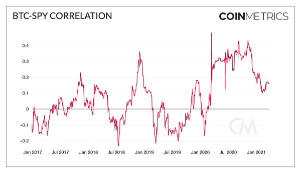 尽管有传统投资者的进入,但BTC与传统市场的相关性在2021年第一季度有所下降。