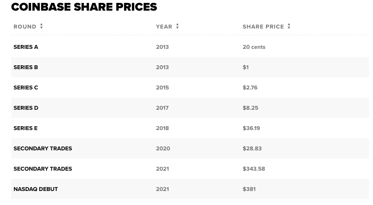 Coinbase的开盘价为每股381美元,这家加密货币交易所的市值约为1000亿美元。截至收盘,该股跌至328.28美元,估值为858亿美元。这比该公司上一次在2018年进行的私募融资高出十倍,比八年前Union Square牵头的一轮融资高出四千多倍。