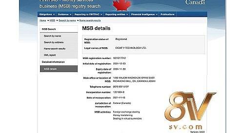 8V.com致力于向用户提供高效且安全的资产管理与交易服务,此次成功通过加拿大金融交易和报告分析中心的严格审核,于2021年12月23日正式取得货币服务业务牌照,有效期限至2024年11月30日,落实其规范化营运的重要发展方针。