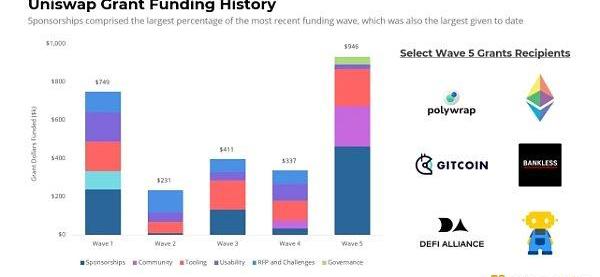 Uniswap赠款计划(UGP)分批赠款,与任何特定季度或预先设定的时间长度无关。可追溯到2021年3月的五次捐赠的数据已公开,而第六次捐赠已经完成但尚未发布。UGP目前正在进行第七波赠款。请注意,在Wave5中资助的几笔赠款发生在2021年第三季度。