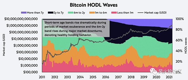像上面紫色区域是持有7年以上的地址币量,黑色是2-7年,绿色是半年到2年,橙色是1月-半年,通常来说短期持有会在市场繁荣时快速增长,而长期仓位多在熊市里增长,市场疯狂的时候反而有减少迹象。