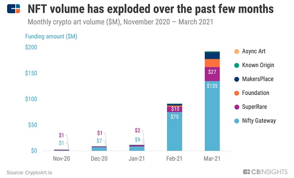 Sorare,SuperRare,NiftyGateway,MakersPlace,Decentry aland,Rarible 等等 NFT 市场也如雨后春笋般蓬勃发展。这是继 2020 年末人们急于通过锁定他们的投机性通证来赚钱的 DeFi 和流动性挖矿热潮之后,又一热潮。
