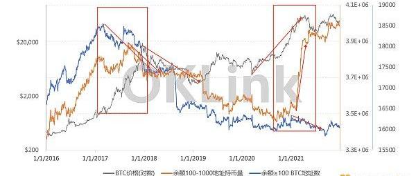 余额100-1kBTC地址持币量vs余额>100BTC地址数vsBTC价格