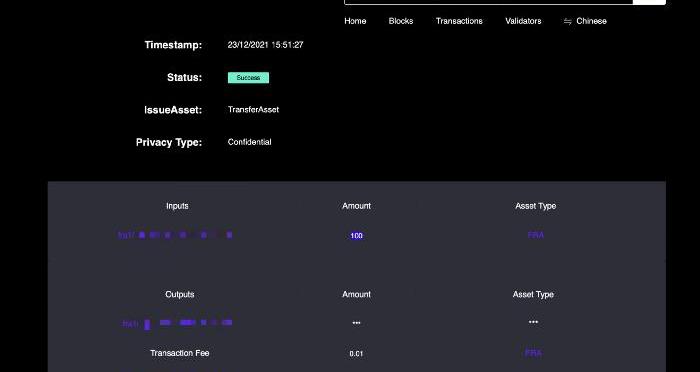 3.在Findora链上进行“隐私转账”成功发送后,您可以在FindoraExplorer上查看交易。如下图,交易的金额和资产类型是保密的。