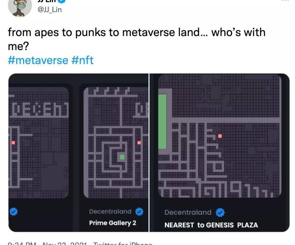 11月23日,林俊杰在推特上宣布已购买Decentraland的三个虚拟地块,共花费约12.3万美元,正式踏入元宇宙世界。DCL成立于2017年,是首个建立在区块链和加密货币基础上的元宇宙社区,共发行了9万块土地,创建了A城、龙城、龙王国等社区。