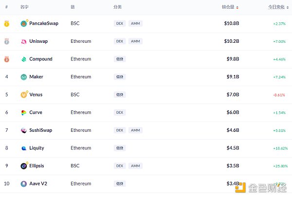 DeFi项目锁定资产前十排名及锁仓量,数据来源:Debank