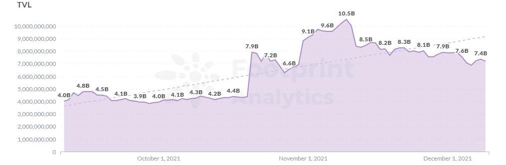 对DeFi项目的加大投入使Tron在TVL上有着不小的跃进,据FootprintAnalytics的数据显示Tron在DeFi领域的TVL已达到75亿美元。