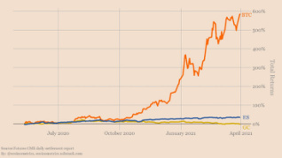 目前市场正在对比特币和黄金做出定价。两者相比,显然市场更看好比特币。下图显示比特币在2020年减半以来,比特币,黄金和S&P的投资收益比较。