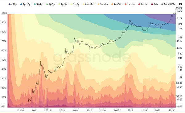 不同的颜色曲线对应不同的币龄区间的比特币占比。