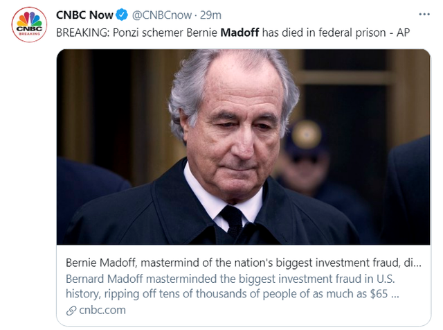 本月,有一位在华尔街名声远波的大人物逝世了,他曾因操纵了金融史上规模最大、最具破坏性的庞氏局,于2009年被判入狱150年,他就是麦道夫(伯纳德·L·麦道夫)。