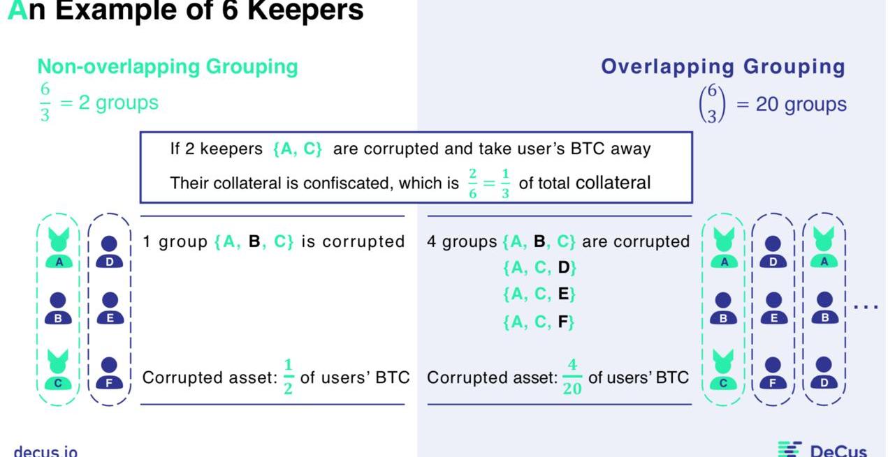 所以,为了平衡大型的托管人群组能够提供的安全性和小型群组能够提供的可访问性,DeCus引入了基于“重复分组”的去中心化托管方案。下面将用6名托管人的简单模型来说明。