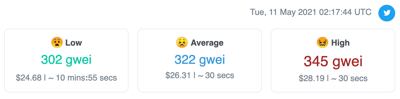 实际上,最近一周,Gas价格一直处于持续上涨趋势中。根据统计,5月7日的平均Gas价格还只有59 gwei,最高价格也只有163 gwei,但到5月11日,目前的平均Gas价格已经飙升至294 gwei,最高价格也上涨至369 gwei。短短4天内,平均Gas价格上涨了398.31%。