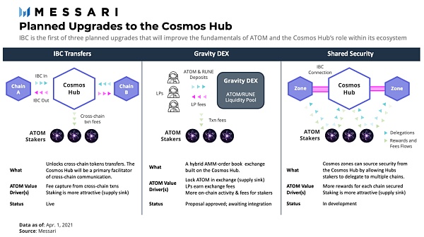 像Cosmos和Polkadot这样经验丰富的网络,都有大量的开发者活动,它们即将发布其定义功能。Cosmos Hub在2月推出了对IBC连接的支持,并在3月进行了转移,以实现跨链通信。这是一系列计划升级中的第一个,旨在改善ATOM的基本面和Cosmos Hub在生态系统中的作用。