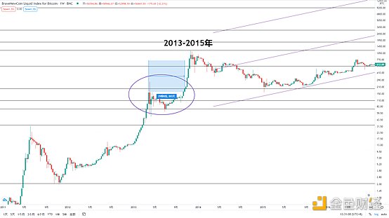 2013年的牛市,BTC触及第一阶段顶,后面进入大区间震荡洗盘的走势,历经将近200天的时间然后重回强势,后面一路直线拉升至13年牛市顶点,这个长时间震荡磨盘的阶段,也就奠定了后面熊市的底部区域,13年牛市结束,14年全年下跌,15年BTC回落至熊市最低,底部区间刚好处于前期盘整的圆弧底的颈线区域,这一波长时间的调整后,BTC后面又拉升了将近10倍。