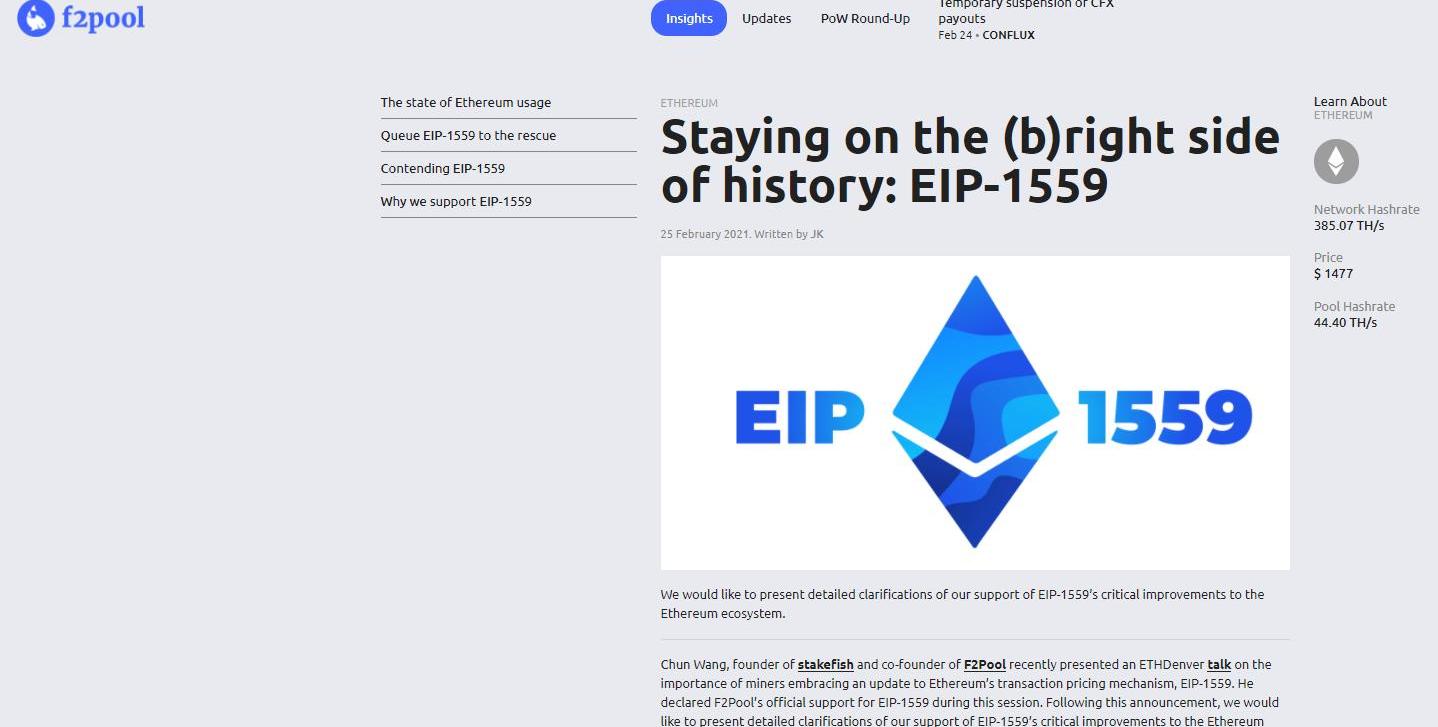2月26日,鱼池(F2pool)发布了一篇文章,题为《站在历史正确的一边:EIP-1559》。文章提到,鱼池将正式支持EIP-1559提案。这是以太坊矿业的重磅炸弹,因为鱼池成了第一个公开站出来表示支持EIP-1559提案的知名矿业组织。