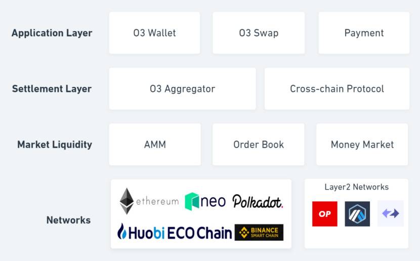 网络层作为 O3 Swap 跨链协议的基础,将集成以太坊、币安智能链、Neo、火币生态链、Polkadot,以及优质二层扩容项目以提供跨链交易。