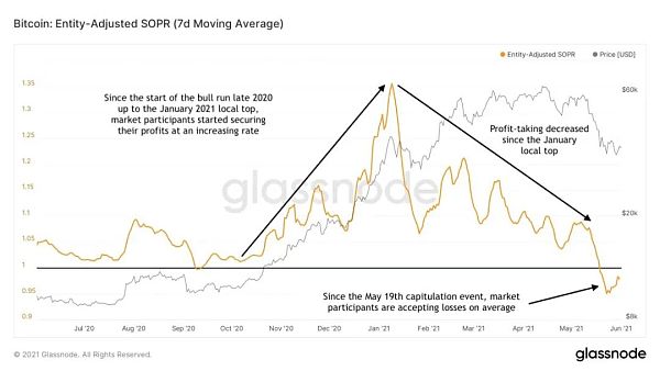 正如你所见,在每次价格大幅增长期间(比如当比特币价格在2020年12月打破有史以来最高价后),市场参与者开始获利,而在图二的时期之后(2021年1月市场最高点开始以来),用户收益减少,尽管在此期间价格仍在进一步上涨。