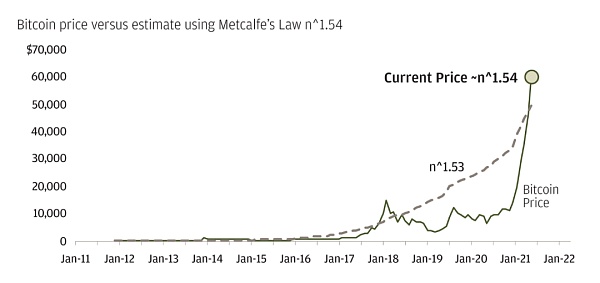 在考虑比特币时,Facebook 的演变和梅特卡夫定律所捕获的网络价值是十分具有指导意义的。我们不是用 Facebook 作为比喻对象,并通过梅特卡夫定律将以获得一个并不精准的目标价格。我们也不会忽视 Facebook 网络可以通过广告更容易地进行变现的事实。这个类比所展示出的一个成熟网络的力量。如今,从各维度来看,比特币网络仍然不成熟,一共只有 7000 万个比特币钱包,全球采用率不到 1%;这意味着新用户对价格(即其指数)的增量影响仍在上升。此外,以当前的比特币价格计算,广义梅特卡夫定律指数值为 n^1.54。该指数表明比特币投资者对比特币的估值与梅特卡夫定律相符,然而价格却有偏离。?