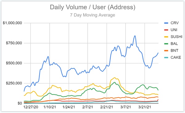 忠诚的社区:Curve 代币的锁定期是 DeFi 中最长的,平均锁定期为 3.7 年。因此,Curve 的代币持有者和 LPs 都希望看到 Curve 的长期成功,因为他们的动机是一致的。3.7 年的平均锁定时长也证明了 Curve 的社区类型——持有权力,且资产负债表可能更大的投资者。事实上,情况似乎就是这样,CRV 代币的普通用户的日交易量要比其他协议高出几个数量级: