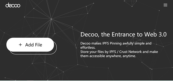 Decoo与奶牛快传的产品正在开发中,所以目前只能通过Decoo官网首页decoo.io的一个“小装置”来体验“分布式云版本的快传”是如何使用的。下图中首页的“Add File”允许用户上传本地文件到IPFS。