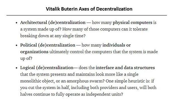 与流行的观点相反,可以跨多个轴定义(去)中心化。Vitalik Buterin通过架构、和逻辑轴线来衡量(去)中心化。