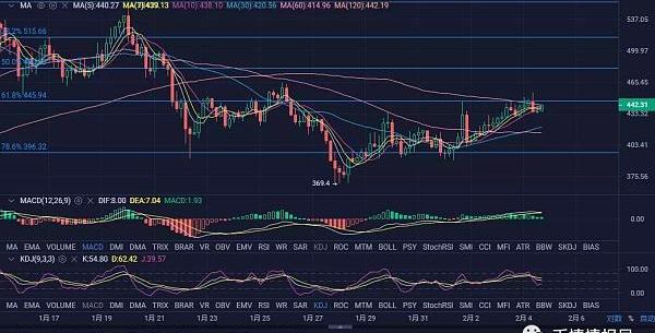 太子今天最高上冲到455美元后遇阻回落,现在又来到了61.8%压力位下方。4小时线MACD零轴以上收敛,KDJ指标逐渐走平,预计后市还将继续测试上方压力位强度。压力位:460美元,支撑位:421美元。操作建议:持币观望。