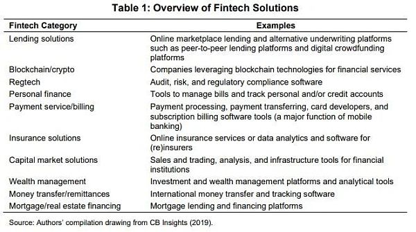 金融科技或数字金融是一种商业方法,致力于通过互联网相关技术使金融服务。通常情况下,金融科技公司在金融领域扮演两个角色。一个是作为传统金融机构的挑战者。在这种情况下,这些金融科技公司依靠算法或基于机器的逻辑来复制传统金融机构的后台流程,并产生新的基于技术的商业模式。另一个是作为先驱者,在没有传统金融基础设施的地方提供服务。例如,通过移动银行和其他基于互联网的自动信息平台提供服务。金融技术包括不同的应用,包括借贷、区块链/加密货币、监管技术、个人金融、支付服务/账单、保险、资本市场 解决方案、财富管理、资金转移/汇款和抵押/房地产融资(表1)。