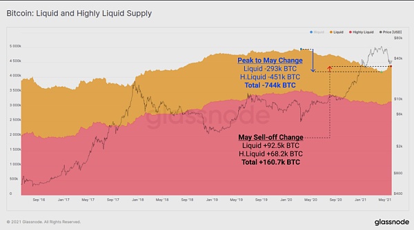 值得注意的是,这16.7万个BTC只代表了自2020年3月以来向另一个方向移动的供应量的22%,即从流动性到非流动性。这意味着,在过去14个月被撤回到冷钱包的74 万个 BTC中,尽管最近出现了这种波动,但其中78%的BTC仍然没有被卖出。
