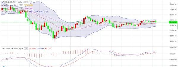比特币周末两天的行情基本上都是震荡为主,相对于周四周五动辄5000点左右的涨跌,完全可以算的上是风平浪静。比特币四小时图看MA5日线上行穿过MA10日线形成金叉触及K线底部,MA30-60日均线持续缓慢下行走势,附图指标KDJ三线粘合运行J线有明显上行趋势,MACD多头能量柱持续放量中。比特币小时图看布林带三轨呈共同上行,币价在布林带中上轨附近运行,MA5日线下行穿过MA10日线形成死叉。附图指标KDJ三线粘合有下行趋势,MACD快慢线平行运行中,多头能量柱减少放量。综合整体数据来看,时光认为晚间短期行情会有一个小幅度的回踩,整体来看行情还是以多头为主。建议回踩31800-32000附近进场多单,目标看33000附近。