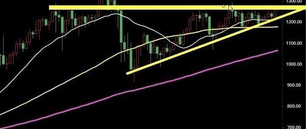 从周K线级别来看呢已经走到17年1422的高点,这个位置和比特币突破2万情形类似,整个盘面已经走出了一个圆弧底部,放在股票里面这是一个非常有生命力生长空间。截止到发文前以太坊突破新高1438.