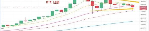 ????今天市场出现回调,主要原因是之前涨多了,跌幅大品种集中在之前获利盘较多的小币种,这里的修正有需要一点时间和空间,短期延续调整的概率大,比较好的进场点要等BTC日线出现实体阳线或者充分回调后出现十字星,市场才有普涨机会。今天算是在白天调整一天,夜间应有超跌反弹,操作上:仓位重的小伙伴趁反弹减仓,仓位轻拿利润在操作这两天看戏,不妨休息一下:短线选手留意在急跌时快进快出抢一把反弹。BTC短期压力位35500~36000。
