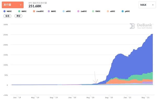 BTC 锚定币的发行量从去年 6 月 1 日的 5200 个 BTC,增长至如今的 25 万个 BTC,一年时间增长了 48 倍。